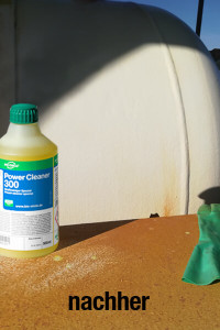 For the removal of limescale and boiler scale residues, rust and corrosion, persistent cement residues, and wall rot. Also sodium nitrate- and salt efflorescence and oxide stains can be removed effectively. Oil and grease incrustations are easily dissolved from exposed-aggregate flagstone, reinforced concrete, and asphalt. Contaminations such as green growth, lichens and moss can be removed from acid-resistant surfaces in parks and cemeteries and on footpaths and terraces. The product won’t pick on surfaces such as glass or similar. The cleaner is ready for use and can simply be applied to the contaminated spot with a brush or paintbrush. Rinse off with plenty of water after a short exposure time. With less persistent contaminations, Power Cleaner 300 can also be diluted.